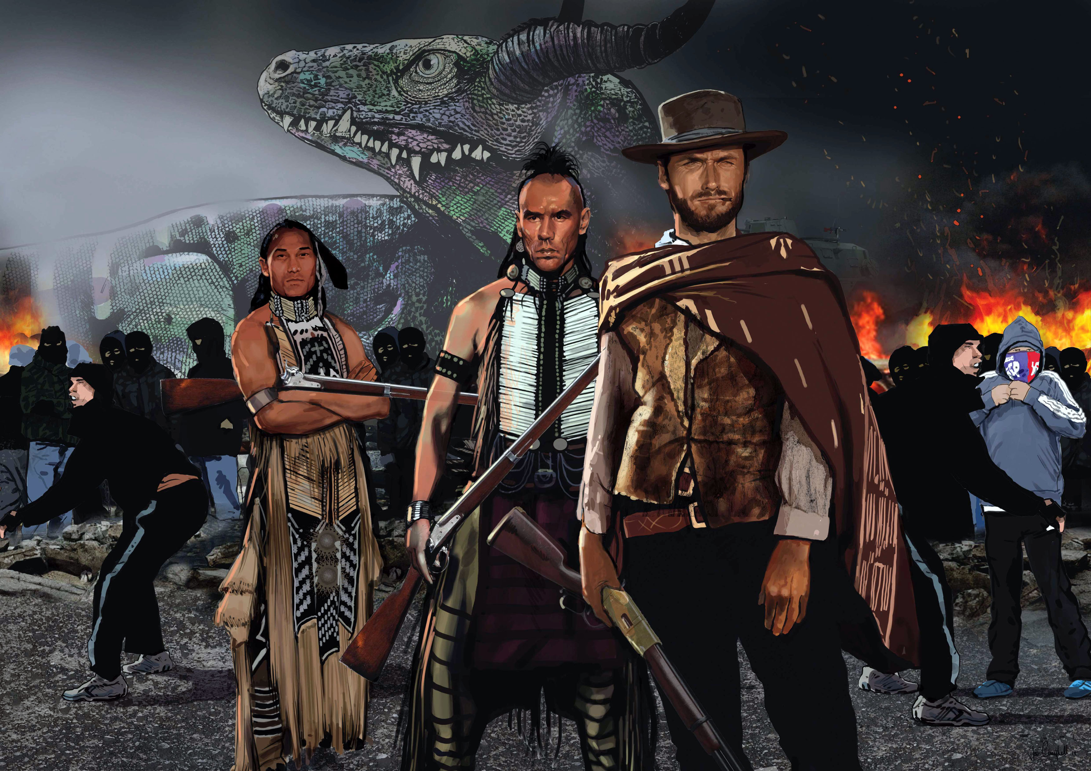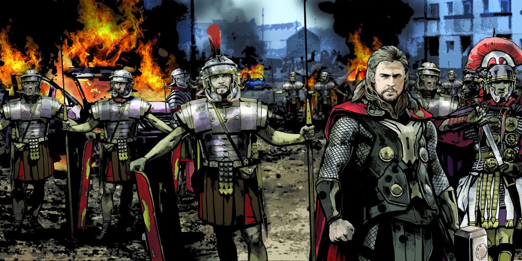Pop stars and movie icons represent the wider world culture from which I felt excluded as a young man. These images are re-contextualised when juxtaposed with the security landscape of my formative years. Placing John Wayne beside British tanks hints at a dominant, macho, male culture of force which I witnessed first-hand. Depicting Roman cohorts in the Bogside refers to the genesis of western imperialist and fascist regimes, that of the ancient Roman Republic and Empire. The quelling of barbarians by the sword, with God on your side has been the model for all self-respecting dictatorships since ancient times.