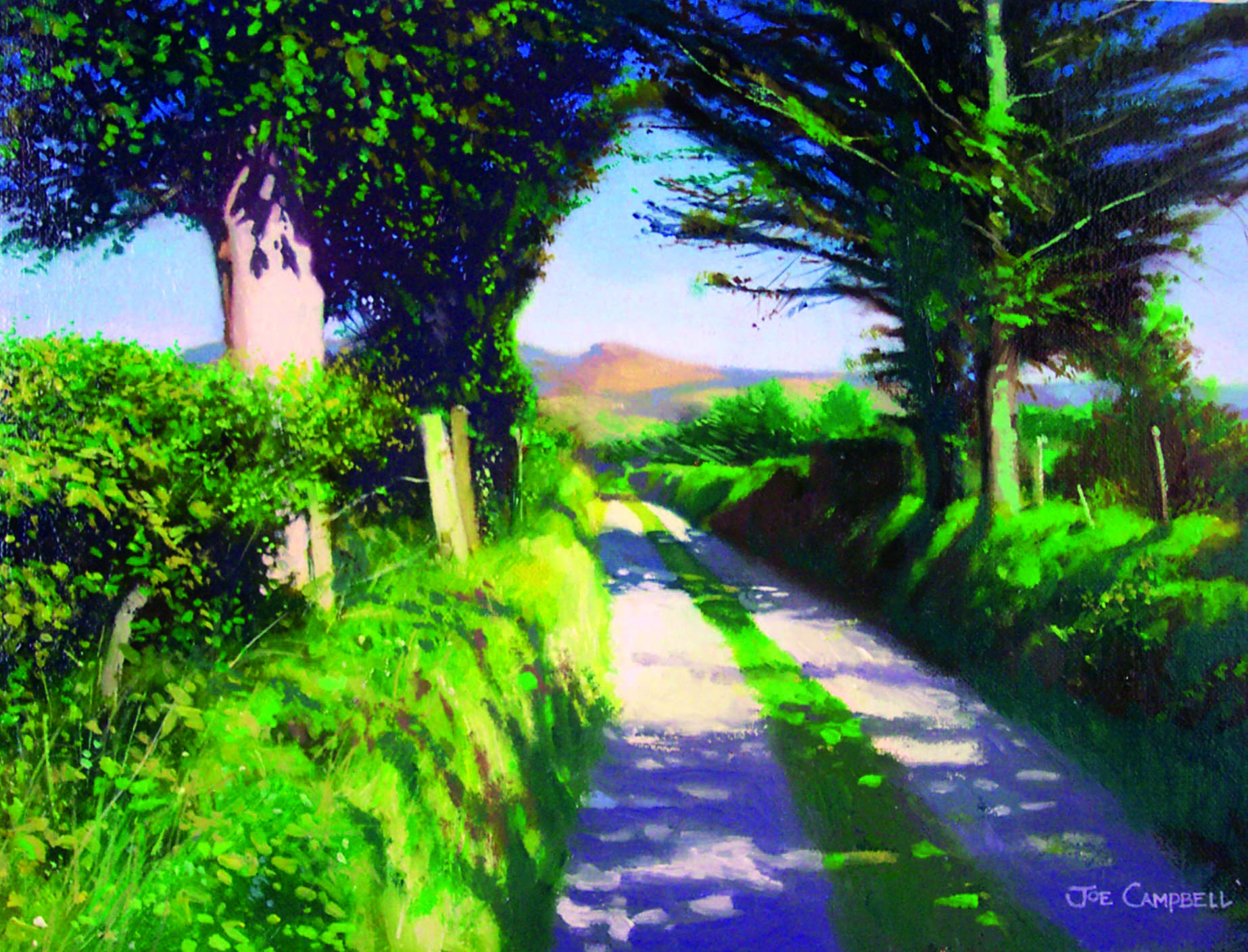 Came across this wee road whilst up in the Donegal Highlands. When I say “road” it was no more than a track really. It probably looked like that a hundred years ago, seemed to be frozen in time. I got the sense that if I kept on walking I’d never round that bend. This was a summers day and that meant one thing to a painter prospecting for subjects and views – colour. The colours that day really sang. I could see the potential of this for a painting. The foreground had these beautiful trees that cast deep purple shadows across the lane. The lines of the laneway took up much of the foreground then led the eye up and into the mid ground where the shadows deepened. Finally, the eye rested on the distant hills that could be just glimpsed in the far distance. A real find indeed…