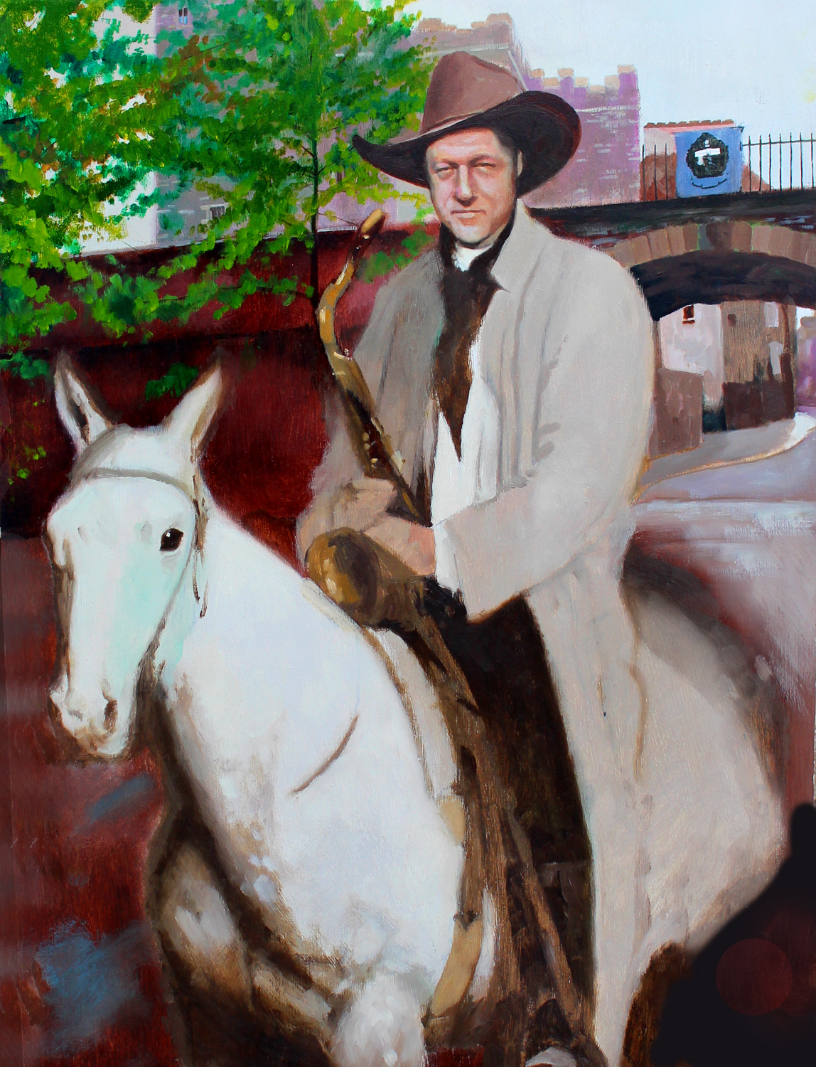 This painting was originally painted in 1995 to celebrate President Clinton’s (and Hilary’s) first visit to my home town of Derry, here in Ireland. This was a big deal at the time. I’m not sure most Americans get to see a serving president in their lifetime but we here in little Derry have had the pleasure of his company five times in twenty years.He first visited Derry in 1995 when he was President of the United States.During that visit, thousands of people turned out to greet him at Guildhall Square.
