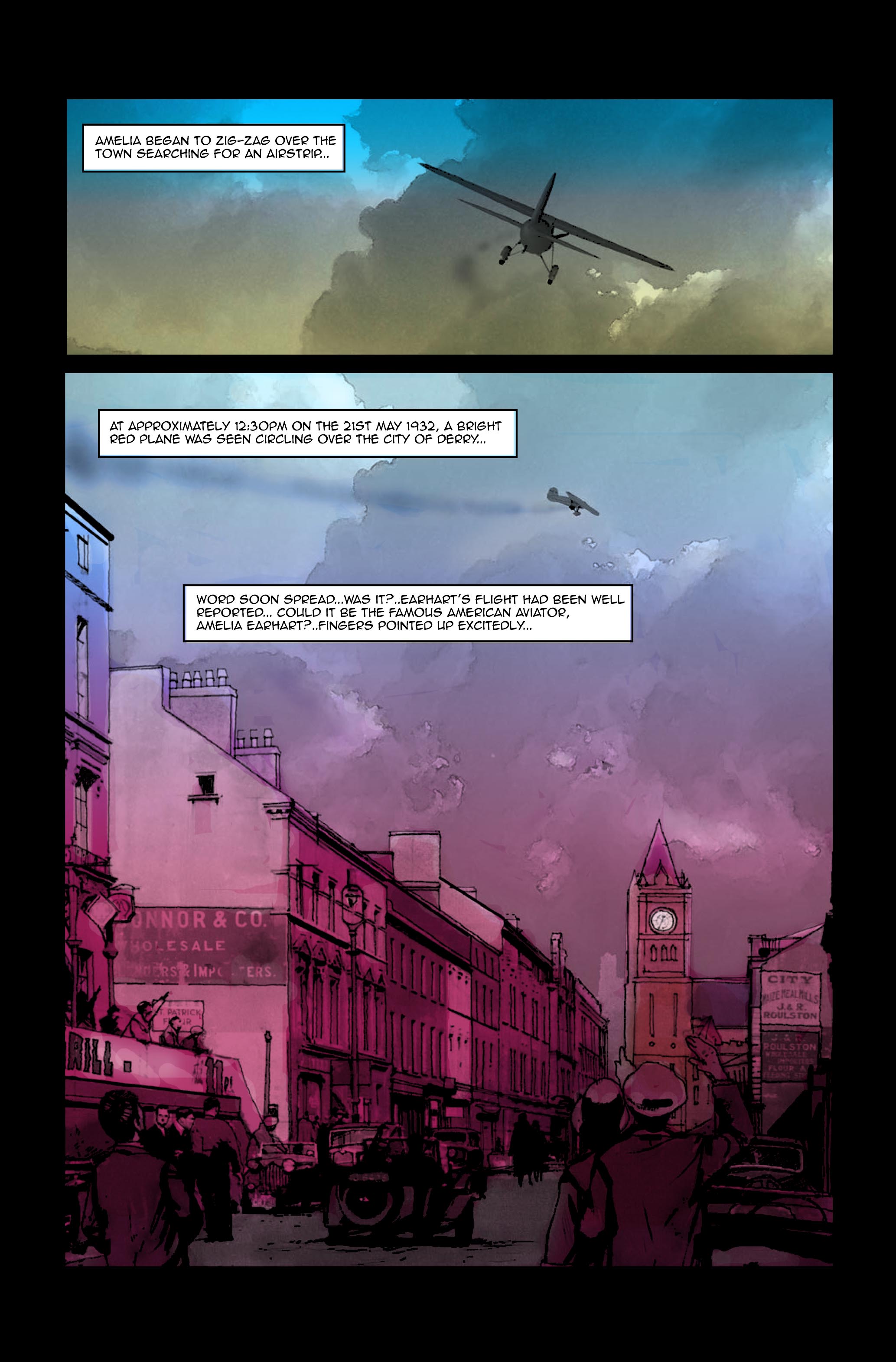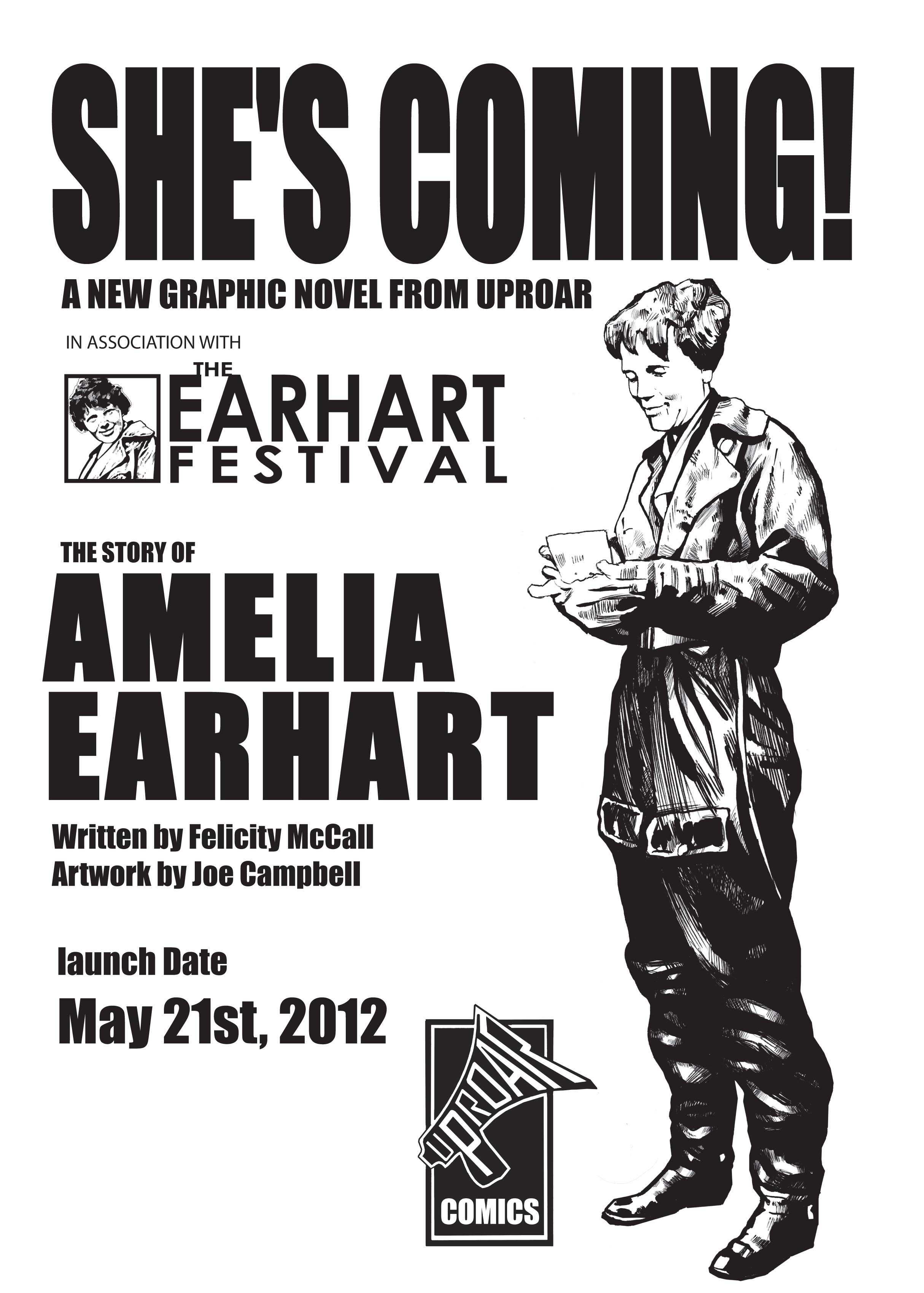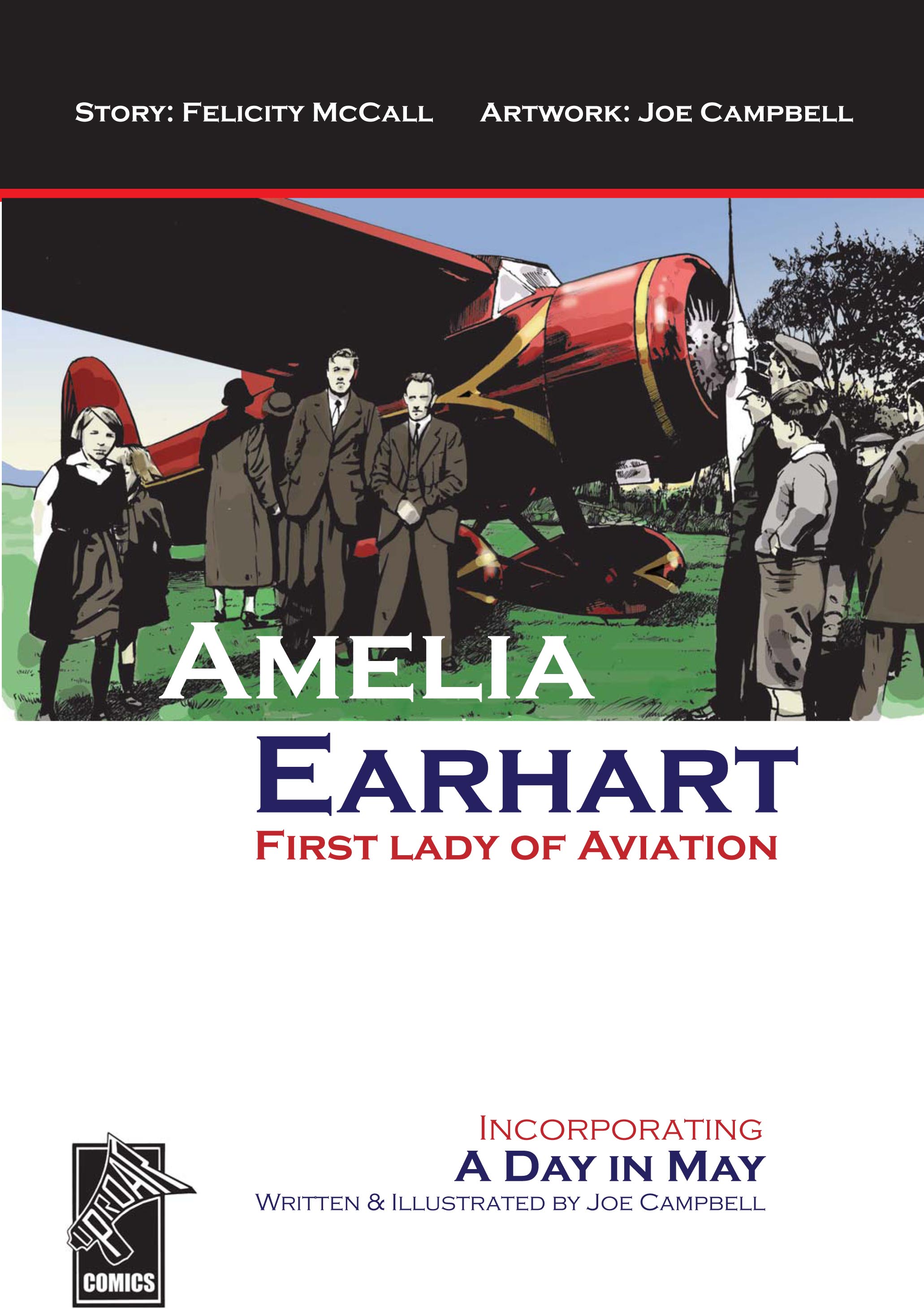 Amelia Earhart, First Lady of Aviation, is the first graphic novel from Uproar Comics and is essentially the story of Amelia in Ireland. A new take on the Earhart legend, half graphic novel, half prose, the book tells the story of Amelia’s 24 hour stay in Derry after flying over 2,000 miles across the North Atlantic in just under 15 hours on the night of May 20th 1932. The book was written and drawn by two natives of Derry, author Felicity McCall and comic book artist, Joe Campbell. The book is in two parts. Part one takes the form of a graphic novel with Campbell’s meticulous art recreating Earhart’s near disastrous, solo, transatlantic night flight, her plane (The Lockheed Vega) and Amelia herself, in fine detail. Although Earhart is well served on the American market this is the first outside perspective of the notable aviation legend and the first Irish publication.